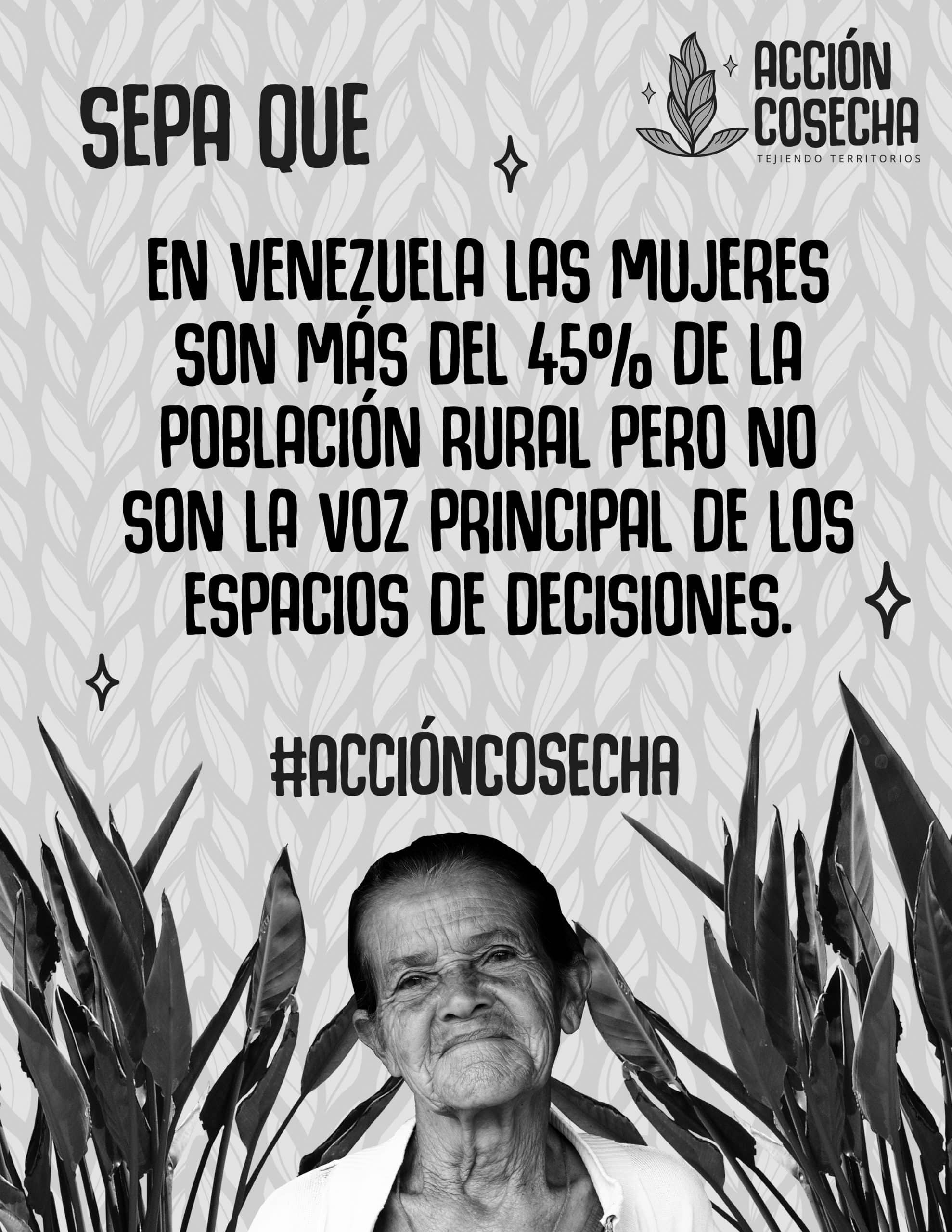 Acción Cosecha es una plataforma impulsada por Las Comadres Púrpuras y la Colectiva Mujeres Cuerpos y Territorios, que vincula lo formativo y la comunicación alternativa para tender puentes, intercambiar aprendizajes, visibilizar y fortalecer los liderazgos comunitarios de mujeres que se organizan en territorios rurales, originarios y populares, tales como la Cooperativa 8 de marzo en Sanare, estado Lara y la organización El agua nos une, y Un Cuatro Pal Conuco en la comunidad El Naranjal, los Altos Mirandinos, estado Miranda, Venezuela.